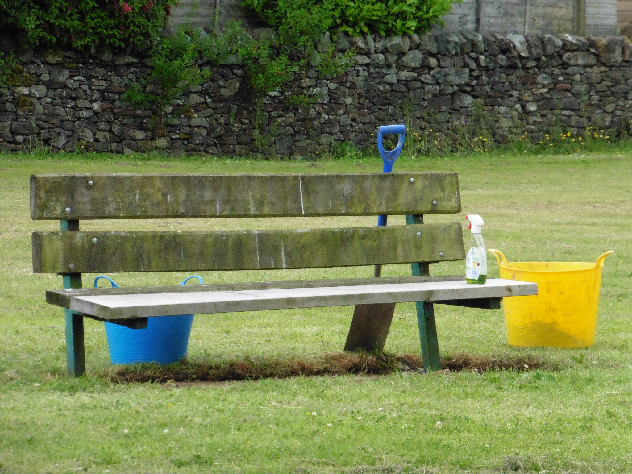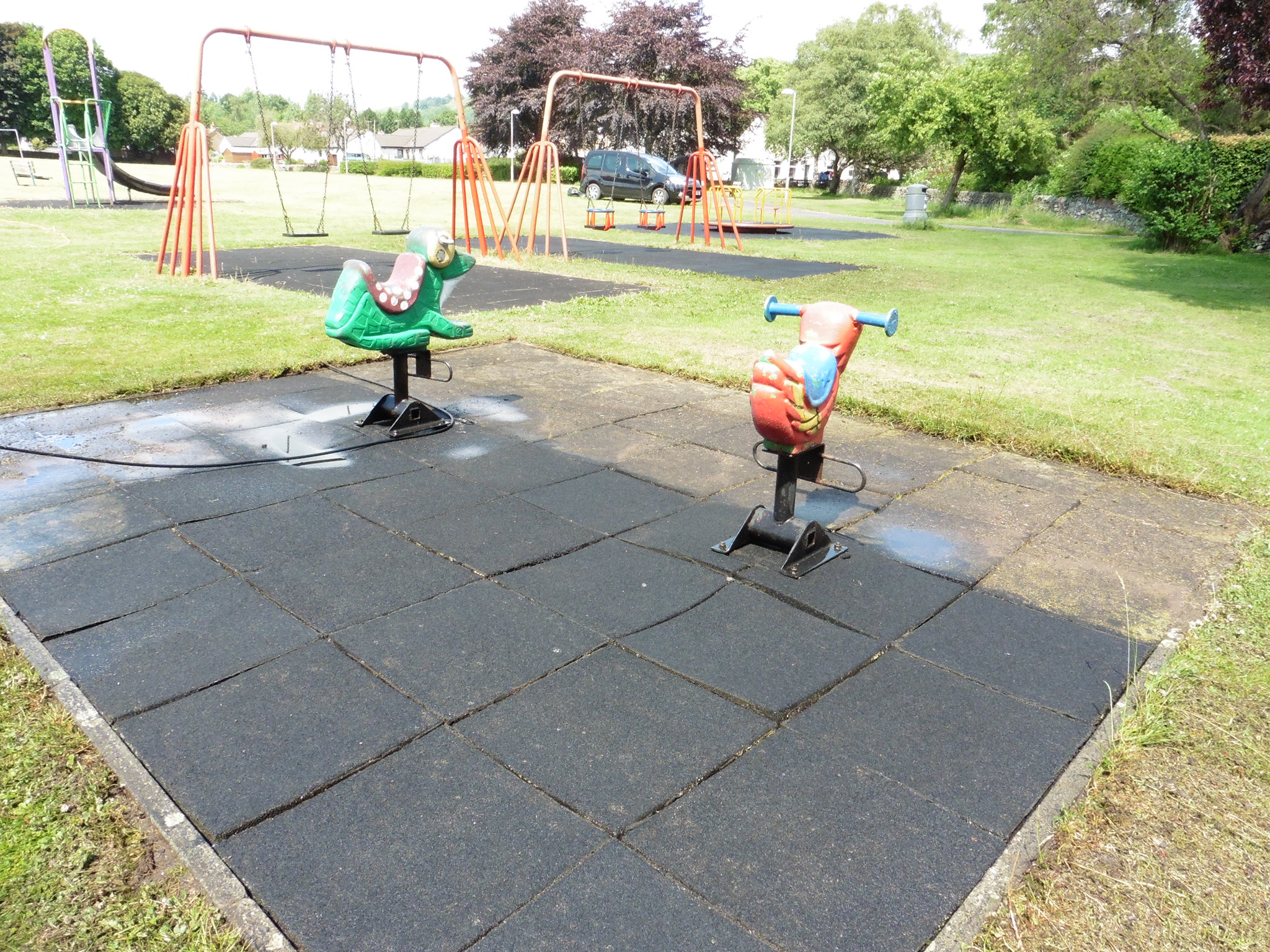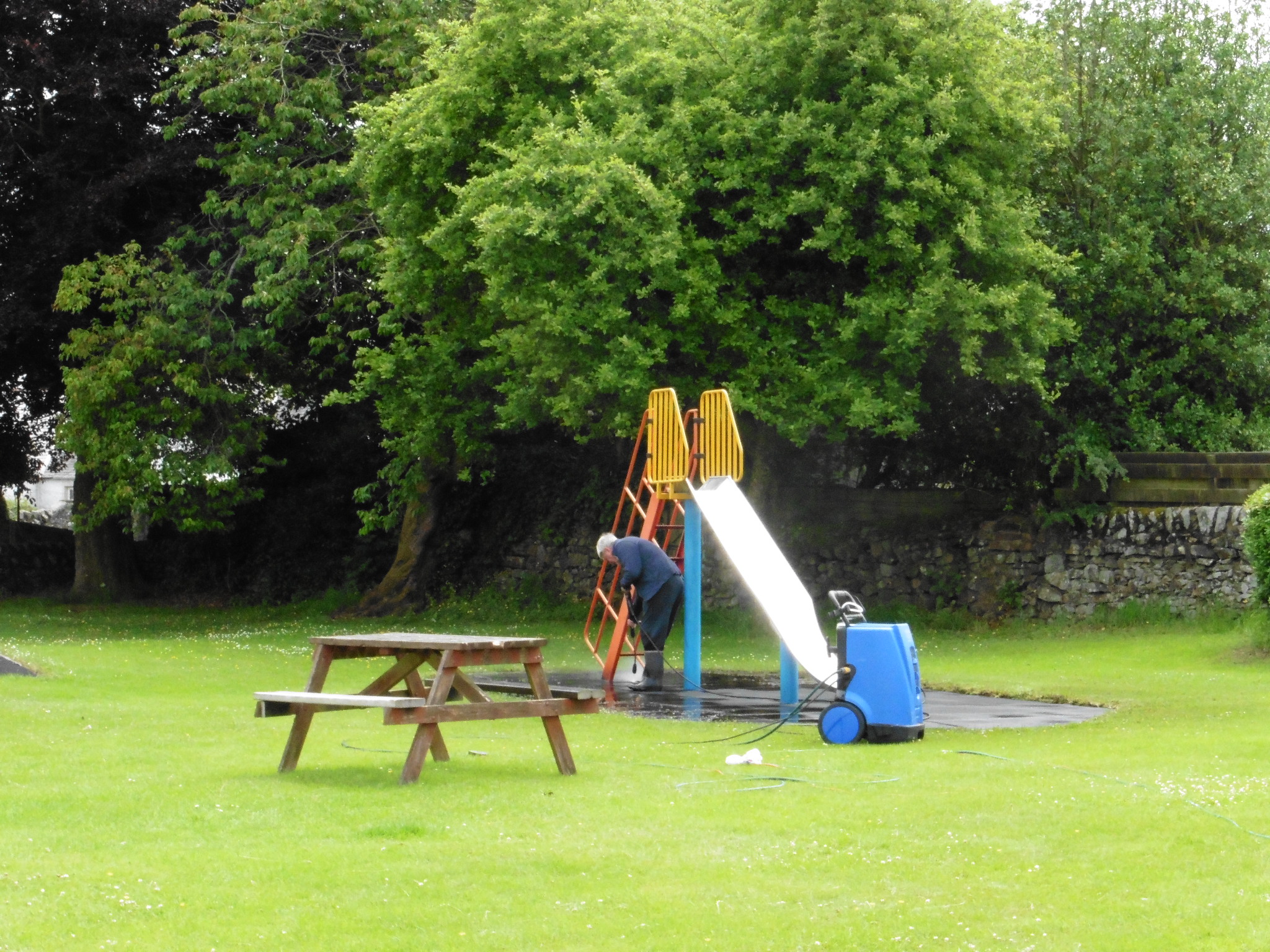 This month we’ve been busy doing some ‘hands on’ work in Macara Park with the Friends group. Following on from a number of comments from parents regarding the slippery condition of the safety surfacing under the childrens’ play equipment, our volunteers decided to roll up their sleeves and tackle the issue. We spoke to the supplier of the safety surfacing, and then to D& G Council (who inspect and maintain the equipment) and agreed that the first approach should be to clean the surfacing thoroughly with a pressure washer (no chemicals, just water). The job took much longer than originally anticipated, but we think the results are worth the effort. We also did a bit of weeding, cutting, and general tidying, to ensure that the play equipment, the benches, and the Park in general is ready for summer. We would like to say a big thank you to Dave, who spent many hours operating the pressure washer, but also to everyone else who lent us the necessary equipment or helped with the tidy-up. Now all we need is for the sun to come out!