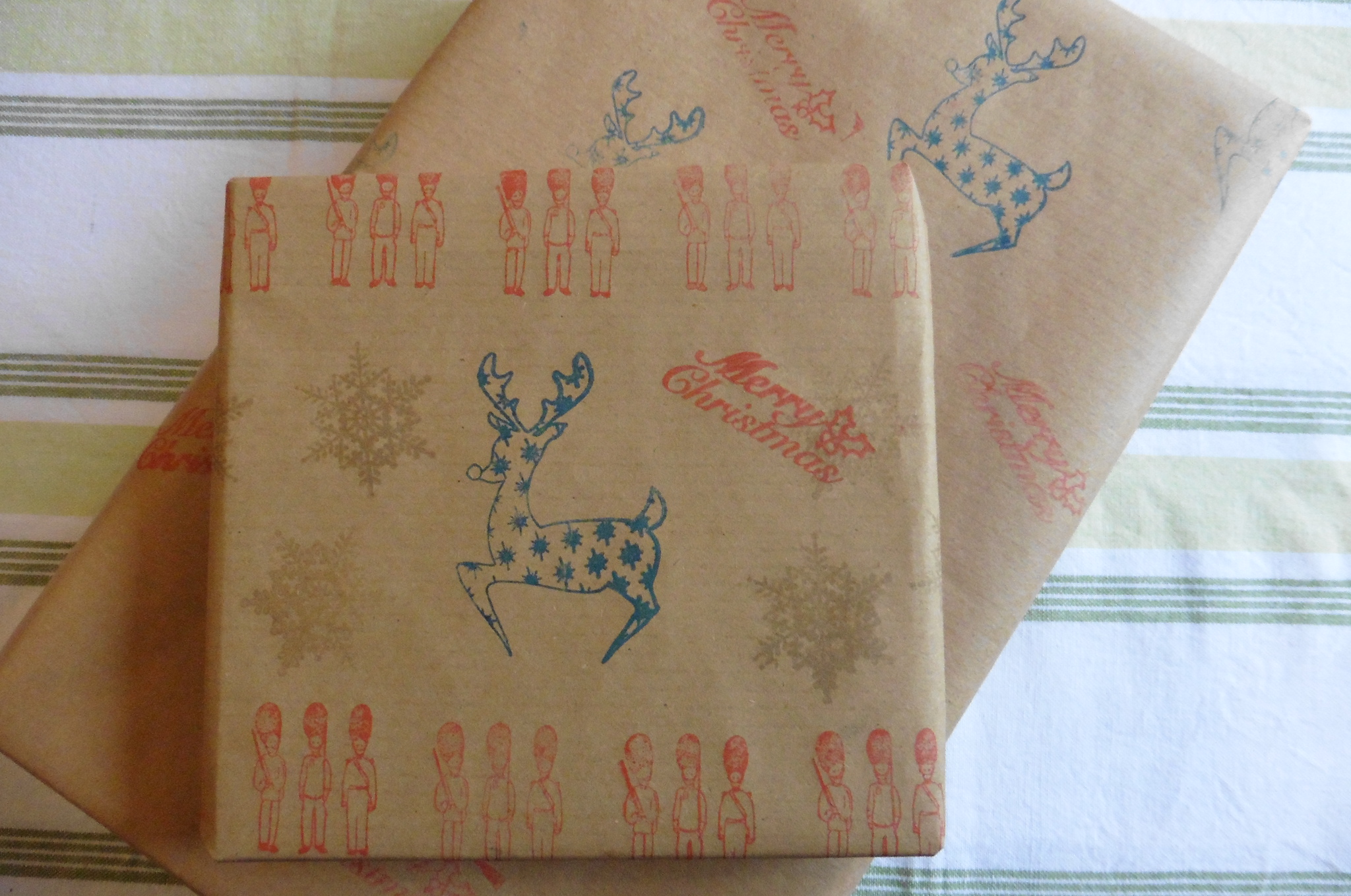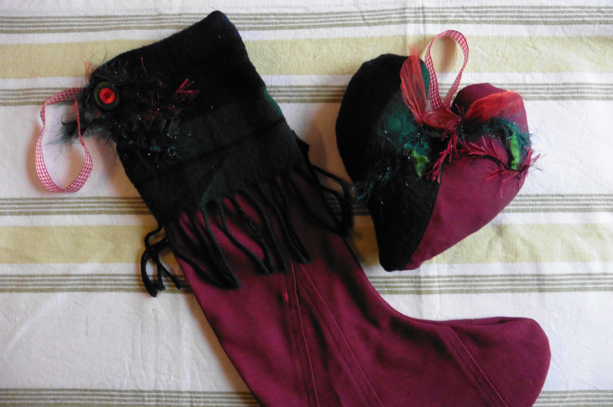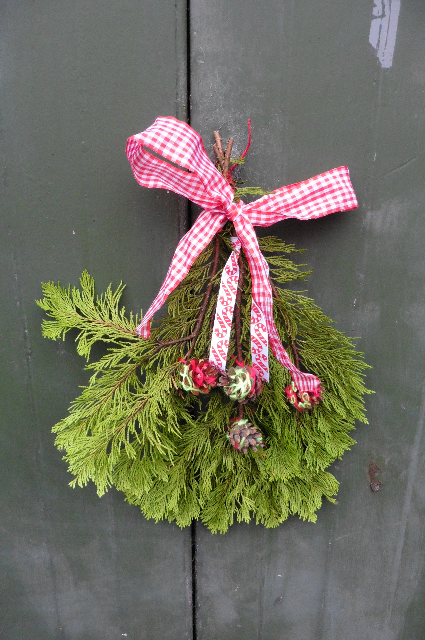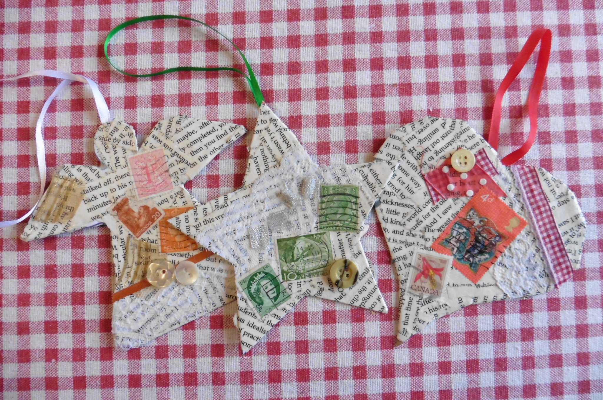 The bottle-cover, stocking and heart decoration were all made from a charity-shop blouse and scarf just a couple of days before they went in the display. The hanging decorations were created from a collection of charity-shop ‘mixed media’ including book pages, stamps, lace and vintage buttons. Even the hanging decorations on the doors are made with re-used ribbons and yarns (-thanks to Moniaive Playcare for the yarn-wrapped pine cones: they really add a splash of colour!) We hope you enjoy looking at our Christmas display as much as we enjoyed making it!