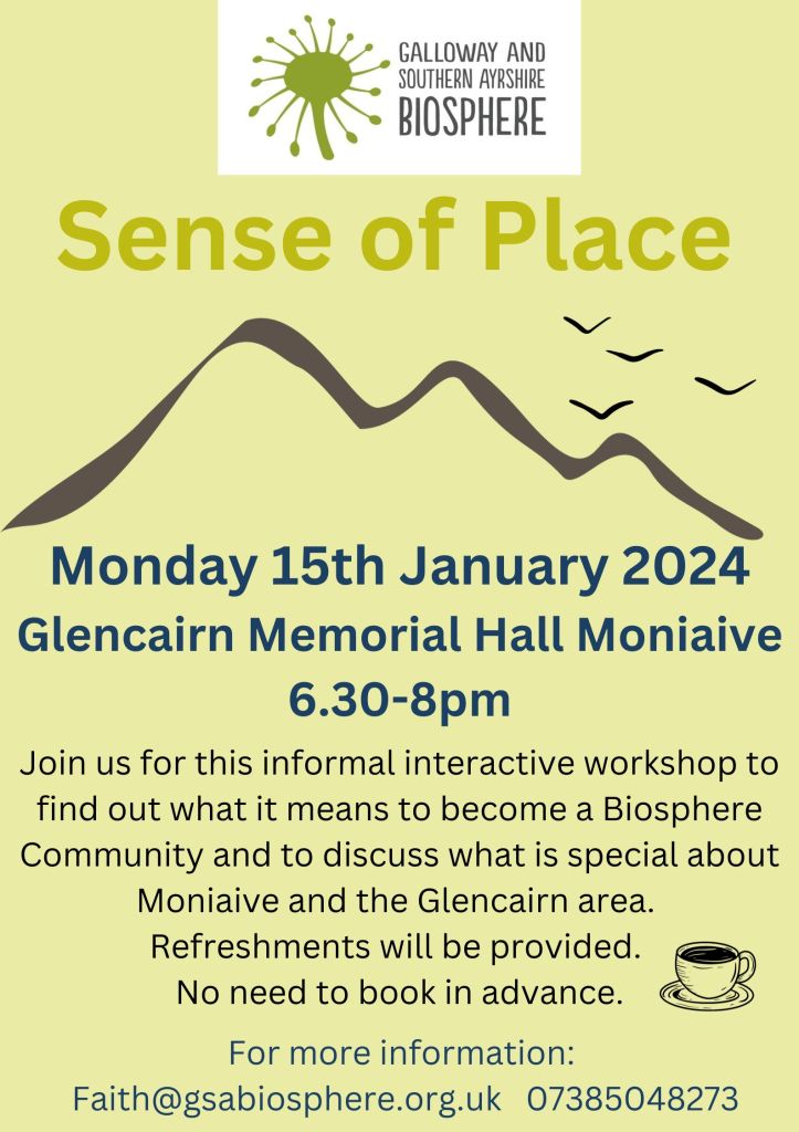 On Monday 15th January we will be hosting the Galloway & South Ayrshire Biosphere at the Glencairn Memorial Insititute, as they hold a Sense of Place workshop. This is your chance to find out about the Biosphere and what a Biosphere Community is. You will also have the opportunity to share your views on what is important to you, what isn’t, and to discuss ideas on how we can protect and improve the things about Glencairn that we most cherish.