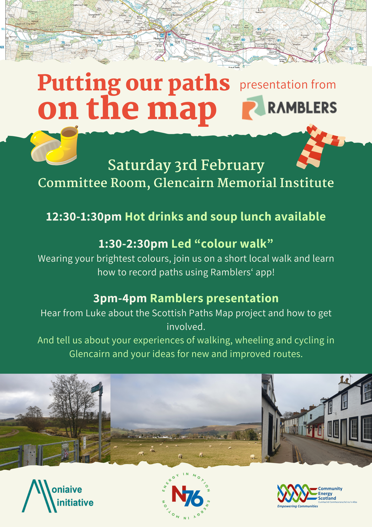 Join us on Saturday 3rd Feb for a day of walking activities. At the Repair Cafe in the morning (from 10am) we’ll provide everything you need to WAX YOUR WALKING BOOTS. We hope you will have time to join us for a Soup & Roll lunch before we all head out for a COLOUR WALK in the early afternoon (-wear your brightest hats, scarves & gloves!) Then it’s back to the GMI to warm up with a hot drink before settling down to listen to Luke from the Ramblers as he explains the Scottish Paths Map Project. Everyone welcome. Children must be accompanied by an adult. Dress for the weather!