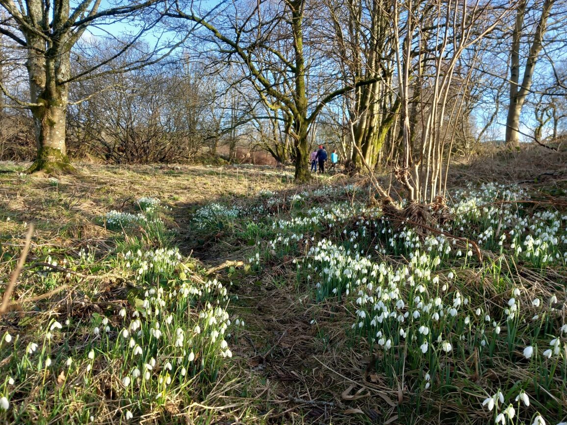 Our walk took us out of the Glencairn Memorial Institute and along Chapel Street to the the Waulkmill Bridge. From there we cut through fields and along the river bank to Blackstone Bridge, before re-joining the river bank to walk along to Holmhead. We crossed the fields to re-join the ‘back road’ beside Blackstone Cottage, returning into Moniaive via Blackstone Bridge and the river bank back to Waulkmill bridge. It was a lovely (almost circular) walk taking in fields, narrow river banks, fields and roads, and giving us views of beautiful swathes of snowdrops along the river, and red kites over the fields.