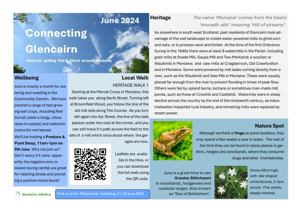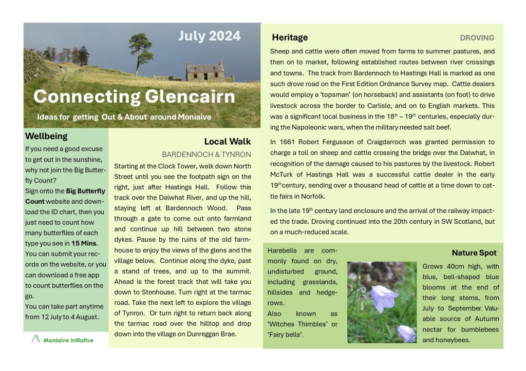 As part of our new Connecting Glencairn project, each month we will be looking at ideas for getting out and about around Moniaive. These will be linked into our current work and will encompass Health & Wellbeing, Active Travel and Community Land Access. In July, we are heading up onto the hillside: