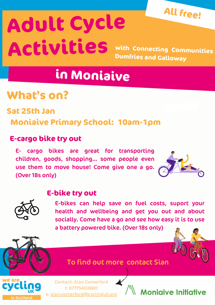 January 25, 2025 moniaiveinitiative **Cancelled**E-Bike Event We’re sorry, but we had to CANCEL our E-bike event, due to the adverse weather conditions. We will re-arrange this, and re-advertise, in due course. Share this: Click to share on X (Opens in new window) X Click to share on Facebook (Opens in new window) Facebook Like Loading... Related